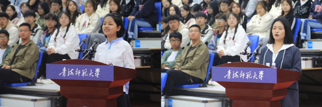 化学化工学院2023级新生周毛、地理科学学院2022级博士研究生何启欣分别代表新生和在校生发言。何启欣表示“不管是学习还是生活都是持之以恒、终见其效的过程”,希望学弟学妹们不断磨炼耐心、学会涵养静心、持续投入用心、永远保持信心,谱写青春华章,开创人生的无限精彩。新生周毛分享了在高中老师和姐姐的影响下与师大结缘的故事,表示要以先进模范人物为榜样,刻苦努力学习,敢于砥砺奋斗!