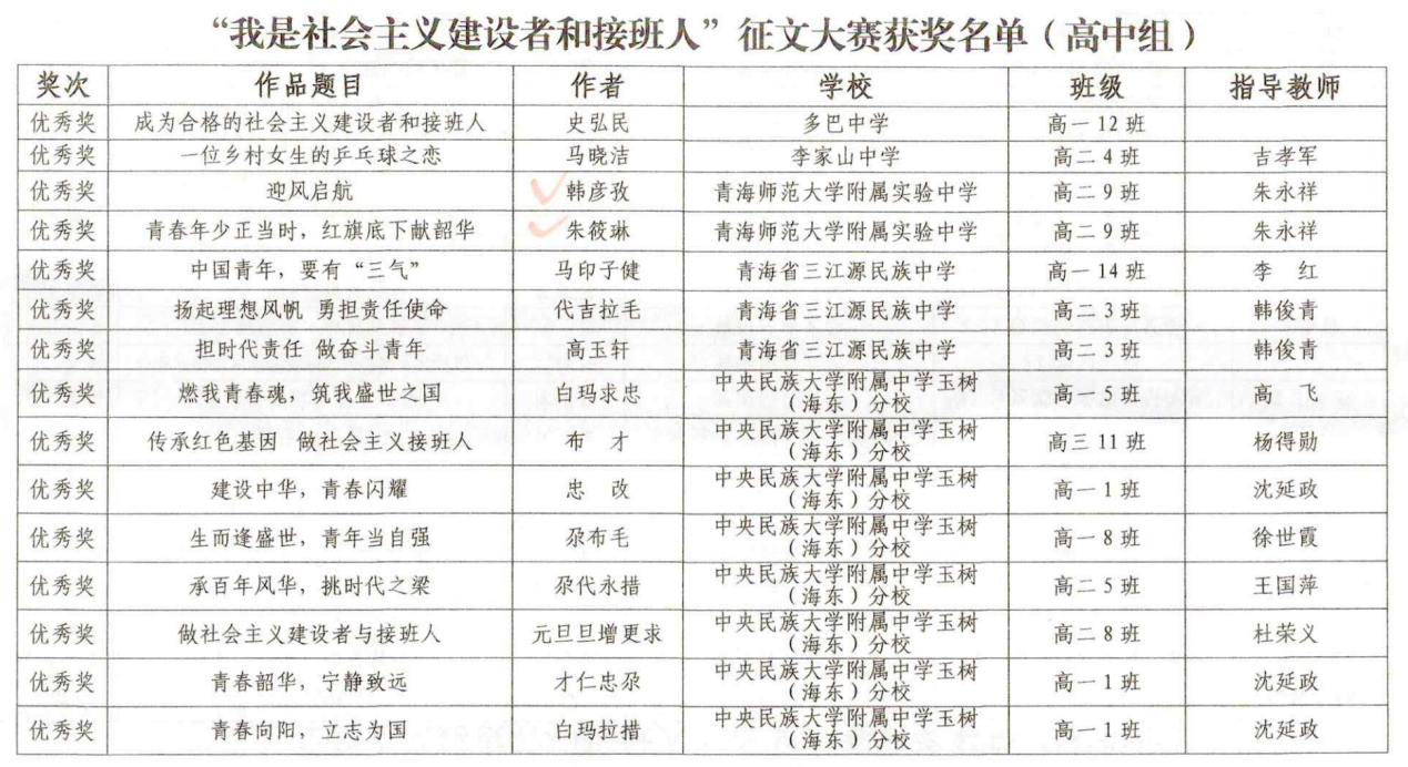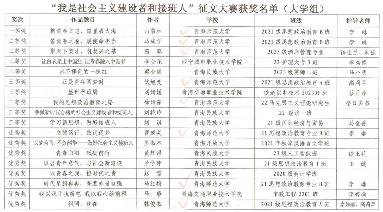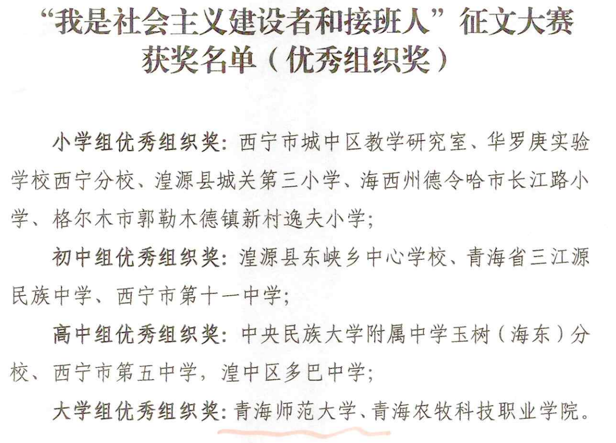 12月25日,由青海省教育厅、西海都市报社联合举办的“我是社会主义建设者和接班人”全省大中小学生征文大赛结果公布。大赛共收到来稿3997篇,其中小学组1932篇,初中组856篇,高中组837篇,大学组372篇。经过严格评审,bat365在线平台登录及其附属实验中学共有10名同学获得大赛个人奖项,bat365在线平台登录荣获大学组优秀组织奖。