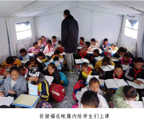 地震发生后,他便积极投身到抗震复课的工作中。此时的他仍发着高烧,但始终冲在了最前线,无论是搬运物资还是搭建帐篷,每次有重活累活的地方都能找到他的身影。作为一名支教实习老师,他时刻关注着学生们的心理变化。在震后的第一节课就为他们进行了心理疏导,并向学生们普及了很多与地震相关的知识,告诉他们如何在地震中进行有效逃生。“如果有机会,希望能带孩子们进行一次地震演练”,在孙骏福看来地震虽然可怕,但逃避不是解决问题的办法,只有让学生们更加了解和认识地震,才能从容面对频繁来袭的余震。