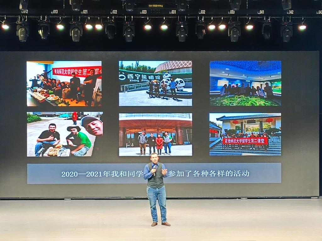 艾杰结合自己三年多来在青海学习、生活的经历,以《仁爱与和谐》为题,讲述了“仁”与人、“仁”与自然的故事。他谈到,疫情来临时,学校为他和其他留学生送去防疫物资和温暖关怀,让他感受到了作为“师大人”的安全感和归属感,是人与人之间的“仁爱”;在朋友家的牧场突遇暴风雪时,朋友不顾自身安危全力营救受灾牲畜,是人与自然之间的“和谐”。艾杰用淳朴的语言和真实的故事,以美国人的独特视角向全世界介绍了大美青海的风土人情和环保理念,赢得了比赛评委的充分肯定。