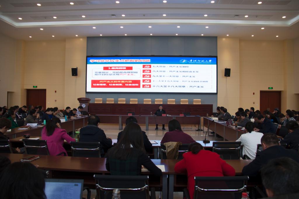 根据学校“不忘初心、牢记使命”主题教育安排部署,10月30日下午,校党委副书记、民族师范学院党委书记梅岩围绕《以习近平新时代中国特色社会主义思想为指导,认真学习贯彻十九大党章》主题,结合个人学习体会,给民族师范学院、组织部(人事处、统战部、机关党委)、宣传部、保卫处、档案馆(校庆校友办公室)、“两弹一星”精神研究院、生命科学学院、法学与社会学学院的150余名教职工党员上了一堂精彩的专题党课。