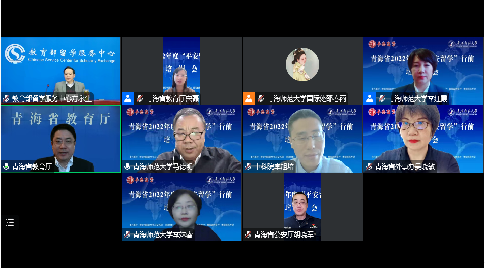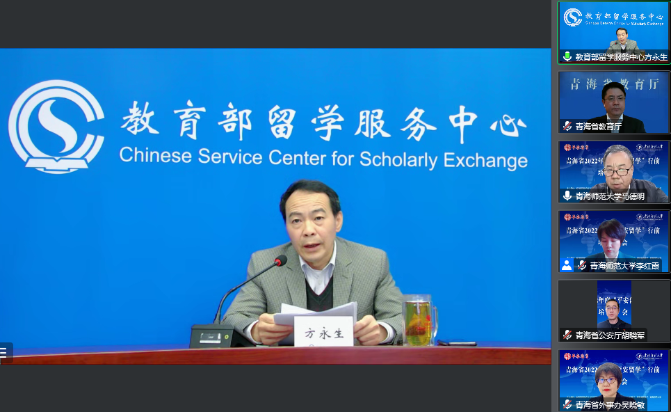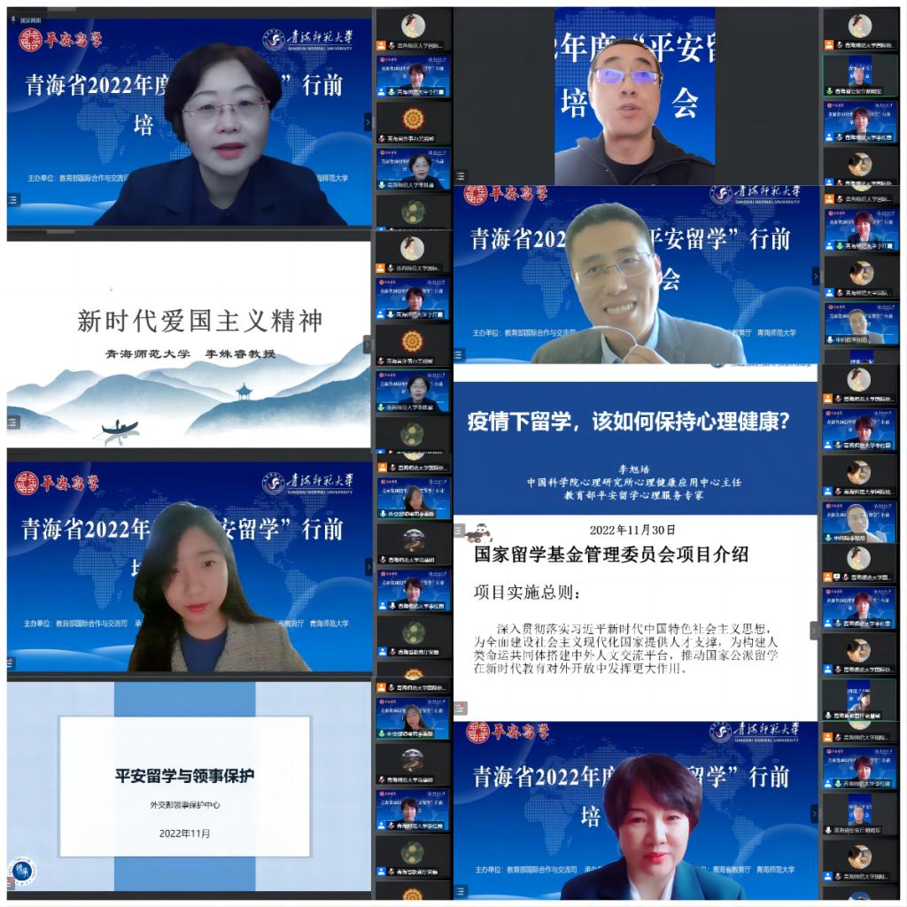 11月30日,由教育部国际合作与交流司主办、教育部留学服务中心承办、青海省教育厅及bat365在线平台登录协办的“青海省2022年度‘平安留学’行前培训会”云端开讲。会议分为开幕式及专题培训两部分。青海省教育厅党组成员、副厅长宋磊,教育部留学服务中心党委副书记、纪委书记方永生,青海省外事办公室省外事办公室出国管理处处长吴晓敏,青海省公安厅出入境管理局副局长胡晓军出席开幕式并讲话。开幕式后,外交部、中科院、省公安厅、省教育厅及365官网马克思主义学院的五位专家应邀从领事保护、爱国主义教育、留学心理健康、公共安全和出国留学政策等方面开展专题培训。全省2022年拟出国留学或有出国留学意向的师生、各单位分管外事工作的领导及工作人员等200余人参加培训。会议由bat365在线平台登录党委副书记、常务副校长马德明主持。