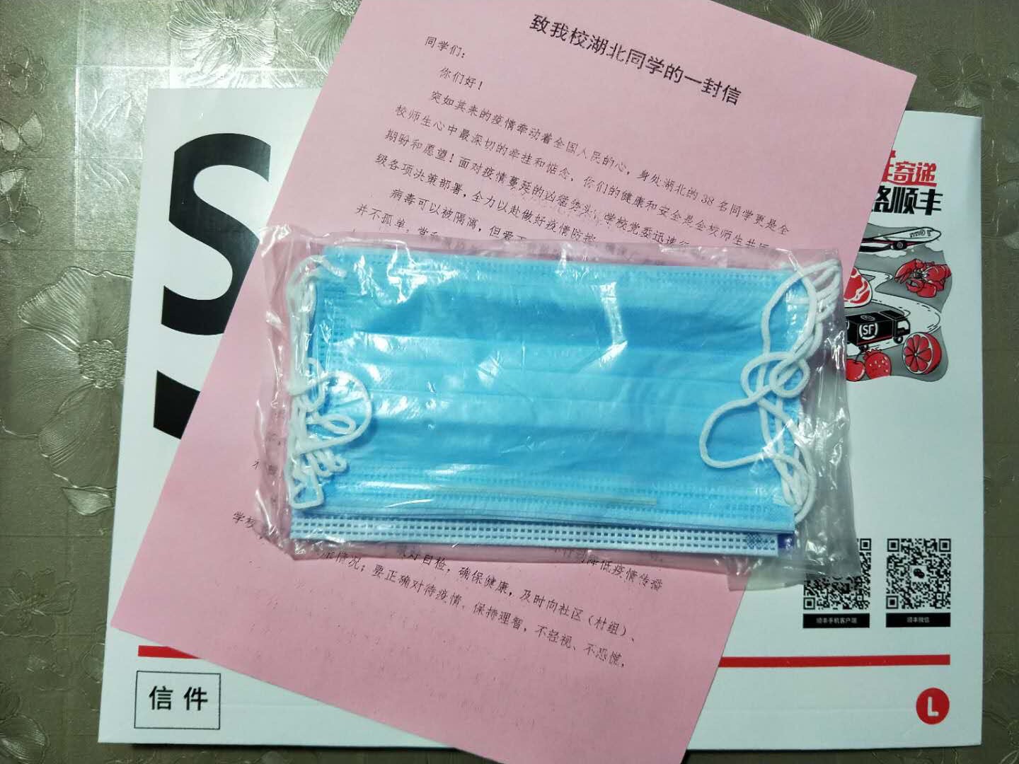 2月22日,一份份装有医用外科口罩和《致365官网湖北籍同学的一封信》的“爱心快递”经由顺丰快递从学校寄出,寄往了365官网身处湖北的63名青师学子手中。