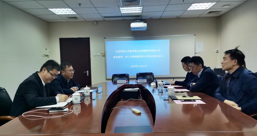11月21日下午,北京师范大学教育基金会捐赠bat365在线平台登录教育援青、对口支援bat365在线平台登录项目签约仪式在北京师范大学举行。北京师范大学党委常委、副校长、教育基金会理事长张凯,bat365在线平台登录党委副书记、常务副校长马德明及两校相关部门人员出席签字仪式。签字仪式由北京师范大学教育基金会副理事长兼秘书长张吾龙主持。