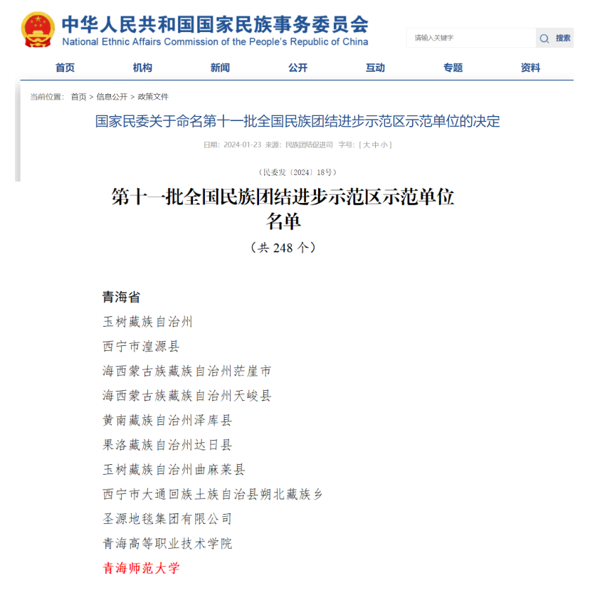 1月23日,国家民委印发《关于命名第十一批全国民族团结进步示范区示范单位的决定》(民委发〔2024〕18号),命名248个地方和单位为第十一批全国民族团结进步示范区示范单位,命名有效期5年。bat365在线平台登录榜上有名,是继2018年荣获“第六批全国民族团结进步创建示范单位”称号后,再次喜获殊荣。