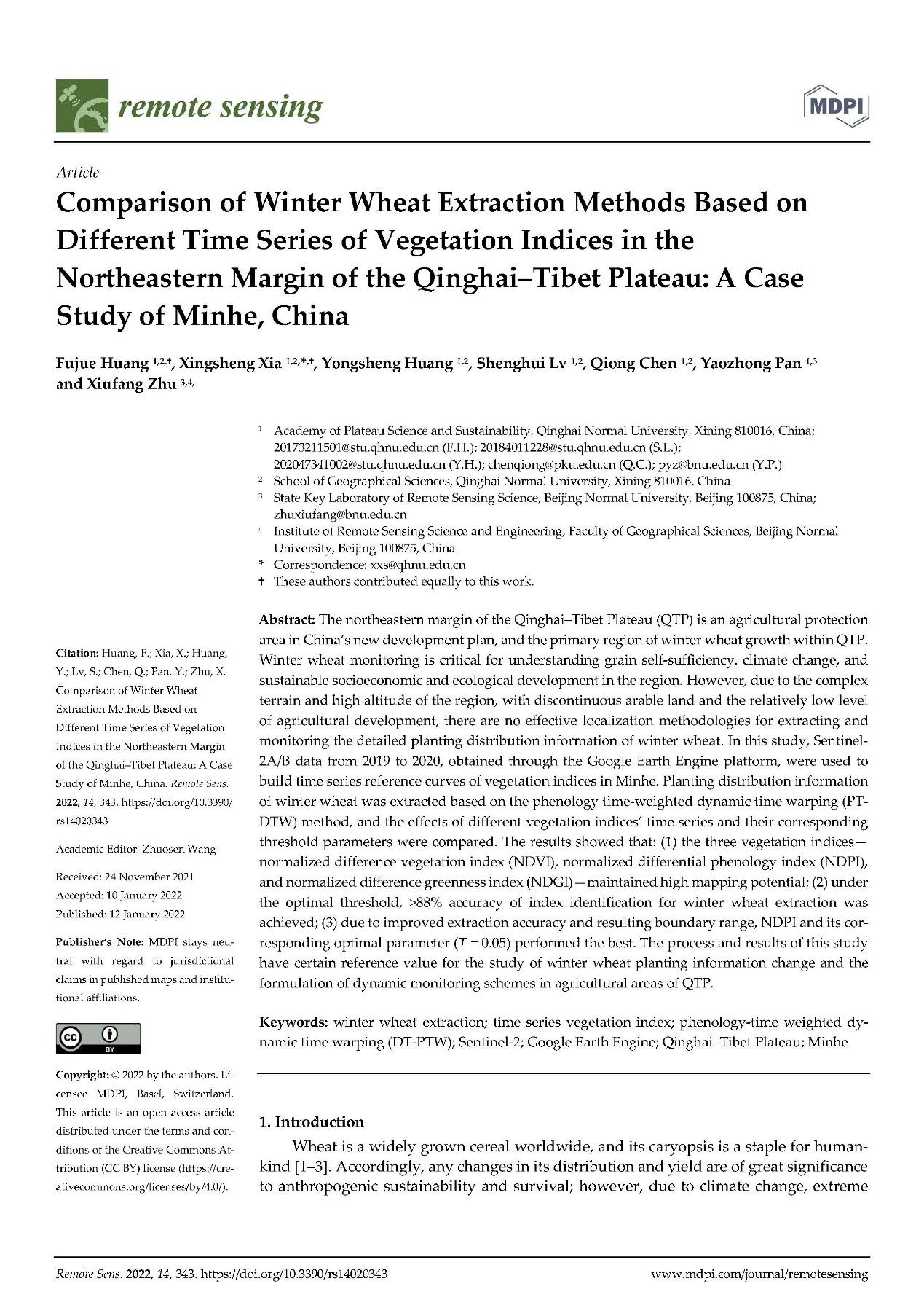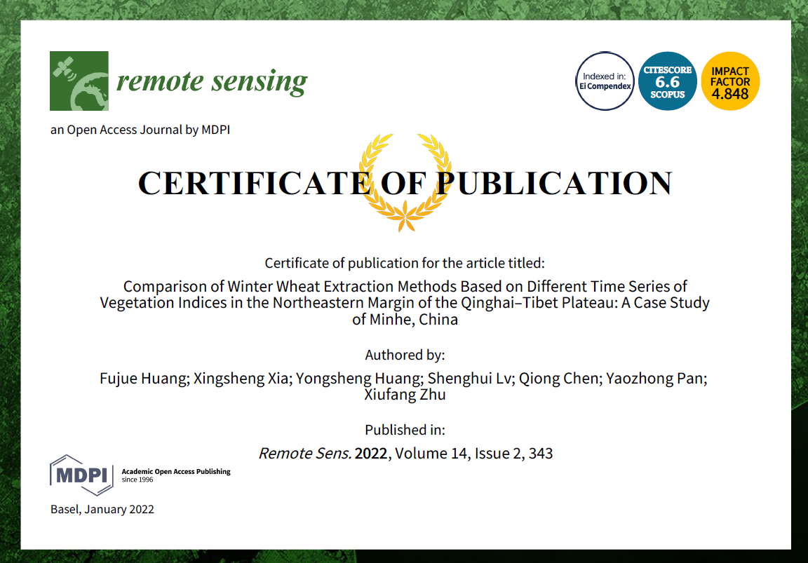 近日,以高科院“高原资源环境遥感与地理信息系统”科研团队成员夏兴生博士(bat365在线平台登录)为通讯作者,由团队学术带头人潘耀忠教授(北京师范大学)和团队成员陈琼副教授(bat365在线平台登录)、团队成员朱秀芳副教授(北京师范大学)协同指导,bat365在线平台登录地理科学学院2017级本科生黄甫觉为第一作者完成的题为《Comparison of winter wheat extraction methods based on different time series of vegetation indices in northeastern margin of the Qinghai-Tibet Plateau:A case study of Minhe, China》的学术论文在国际SCI期刊《Remote Sensing》(中文名:遥感;JCR 1区,IF影响因子4.848)上发表。这是高科院成立以来,所属科研团队首次指导本科生以第一作者在国际JCR 1区期刊发表学术论文,充分体现了高科院支持与服务学校事业发展的初衷和宗旨,高科院科研团队助力学校教育教学,提升本科生教育成效的作用进一步凸显。
