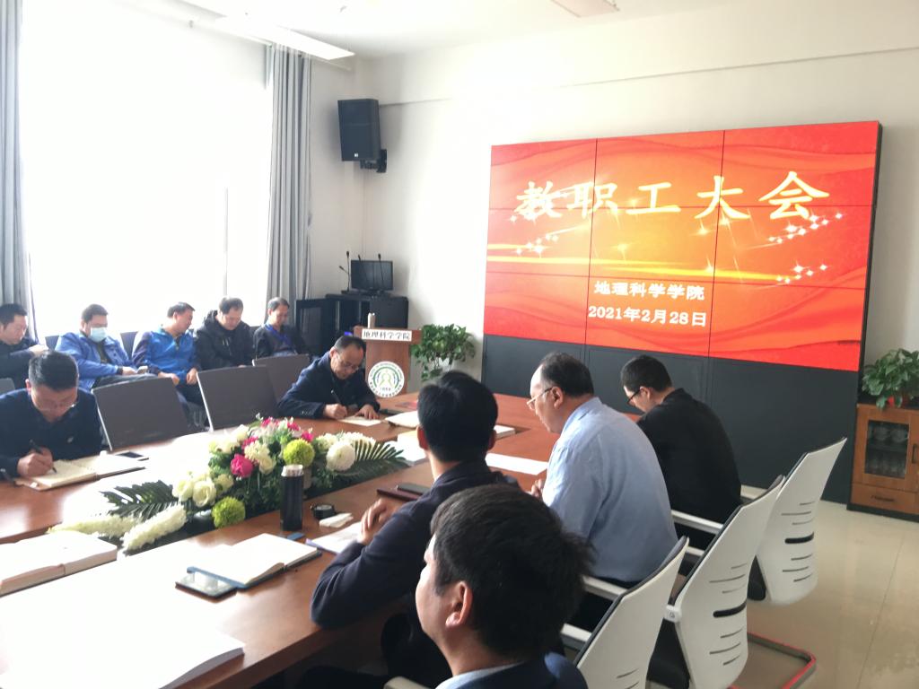 为切实做好开学准备工作,确保新学期各项工作正常有序开展,2月28日下午,地理科学学院召开2021年春季学期开学工作会议,部署新学期各项工作,会议由党总支书记、副院长杨登兴主持,副书记洛加才让、副院长毛旭锋、副院长杨显明及学院全体教师参加会议。