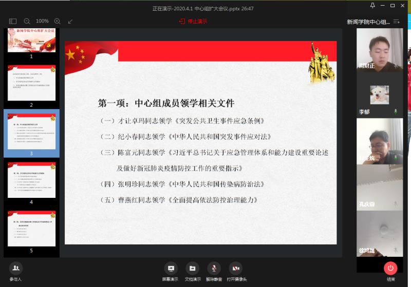 4月1日,新闻学院党总支召开中心组扩大会议,会议由新闻学院常务副院长甘生统主持,学院全体教职工党员参加了会议。