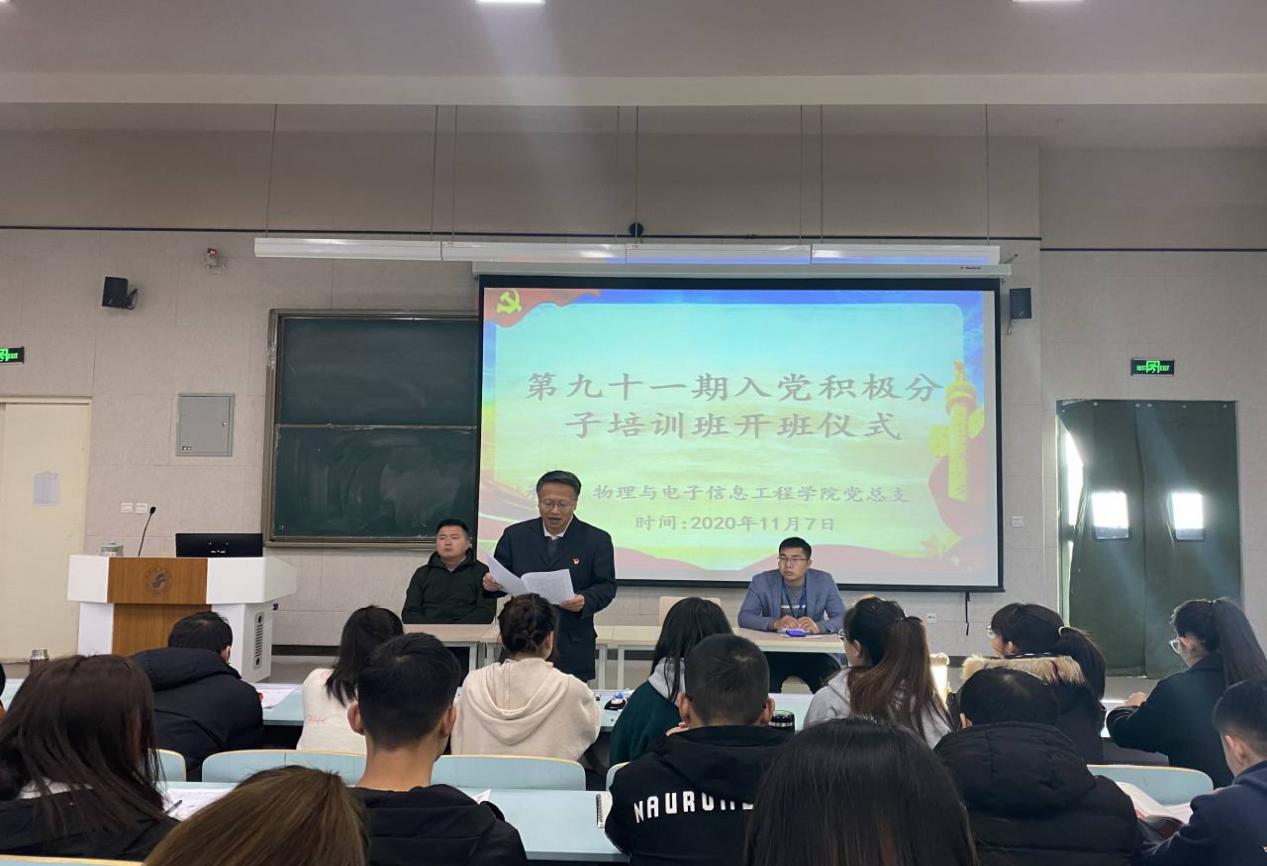 11月7日,物理与电子信息工程学院牵头承办的物理与电子信息工程学院、数学与统计学院、文学院、历史学院、体育学院、化学化工学院、计算机学院、地理科学学院等八个学院的入党积极分子培训工作开班仪式在西二楼219教室准时开始。物理与电子信息工程学院党总支副书记王敬佩同志主持了此次开班仪式,培训班班主任刘松老师、王正斌老师以及195名入党积极分子参加开班仪式。