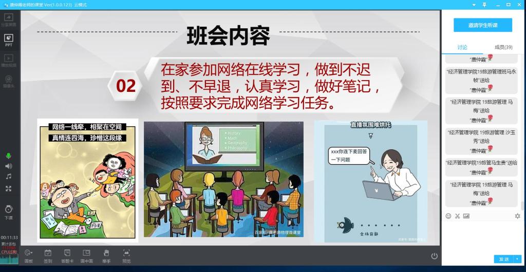 疫情阻挡了师大学子来校学习的脚步,但无法阻止教书育人的工作继续。3月1日晚,经济管理学院32个班共计1268名学生,通过不同的网络媒体参加了以“携手并进,共克时艰”为主题的班会。