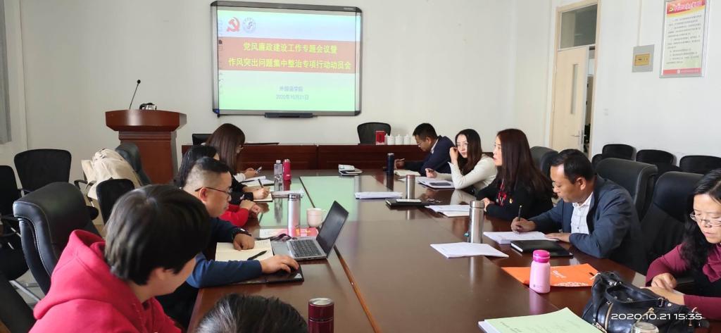 10月21日下午,外国语学院党总支召开党风廉政建设专题会议,研究党风廉政建设工作,部署作风问题集中整治专项行动。学院领导班子成员、党总支委员、全体教师党员参加会议,会议由党总支书记马金芳主持。