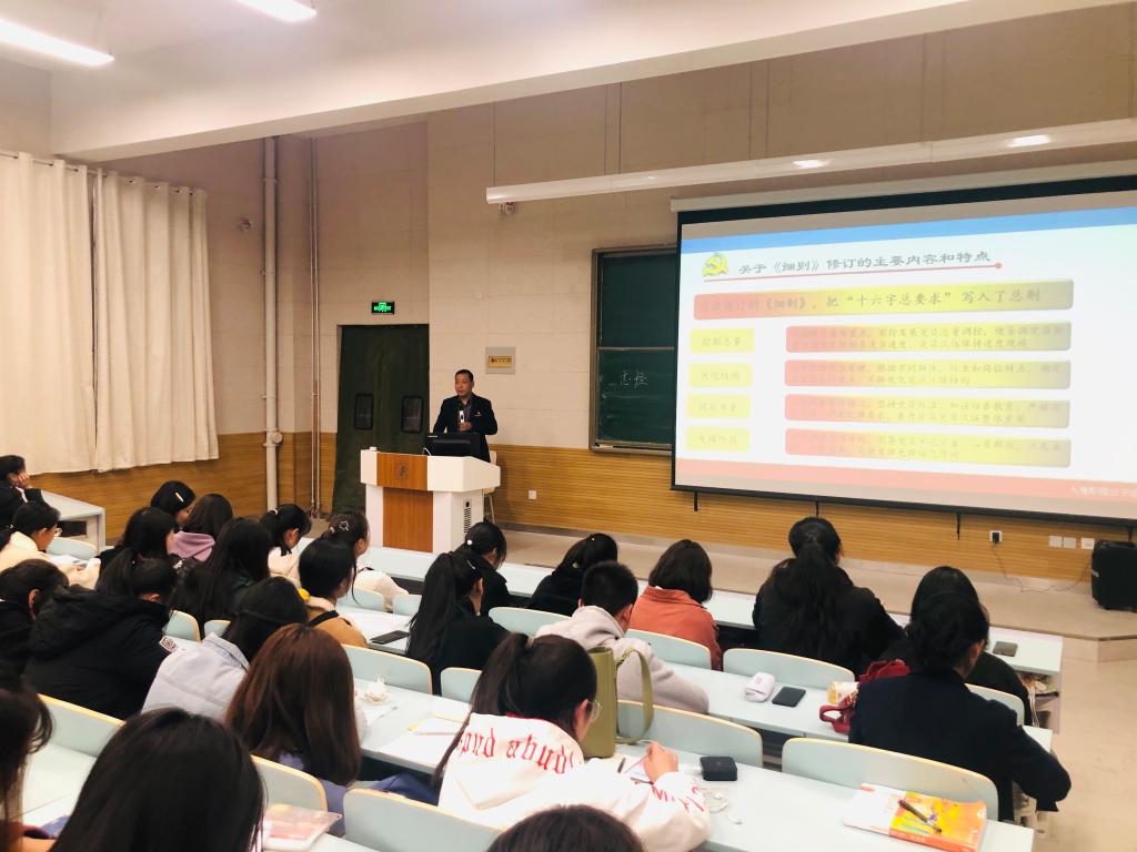 讲座中,张胜鹏同志围绕《中国共产党发展党员工作细则》修订背景、重大意义、主要内容和特点、各章节的具体内容,从申请入党、入党积极分子的确定和培养教育、发展对象的确立和考察、预备党员的接收、预备党员的教育考察和转正等五个方面对大学生入党的基本程序进行了详细的介绍。他强调,广大青年朋友应该自觉以党的指导思想作为自己的行动指南,用习近平新时代中国特色社会主义思想武装自己、提高自己,努力学习科学文化知识,争做“有理想,有本领,有担当”的新时代合格大学生,争取早日加入党组织。
