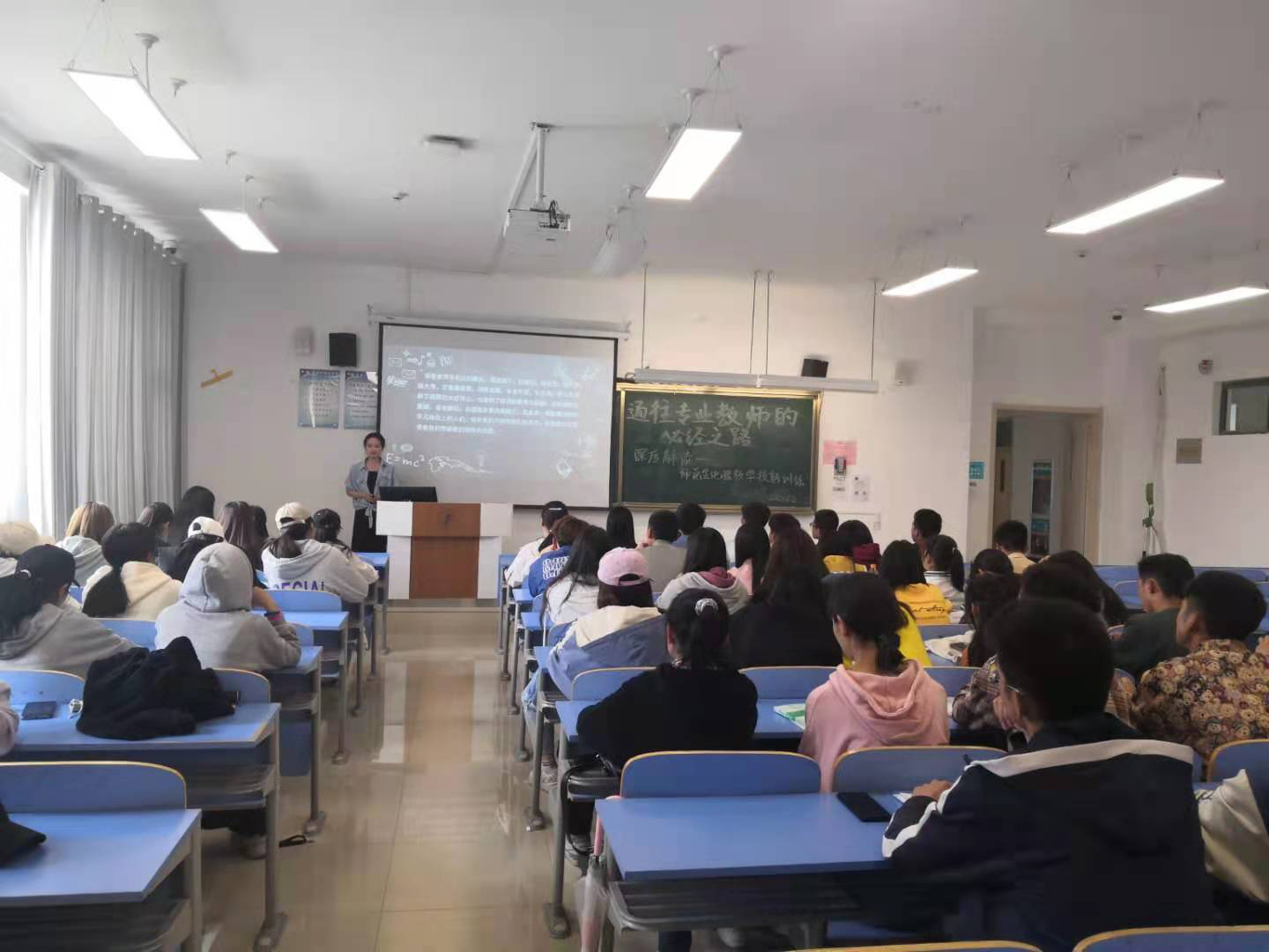 马老师以自己大学期间的师范技能训练过程以及从教八年来的回顾开始讲座,分享了师范技能训练中影响最深、至今受益最大的训练方式及内容。她指出,深入分析、准确掌握教学观和教材观对教学技能的提升具有重要意义。讲座中马老师以具体的教学案例向大家介绍了教学技能训练的方法和建议,立足于教材内容的呈现,借助手机视频录制功能进行微课制作与微格教学训练,积极开展教学实践,努力提高教学实践能力。