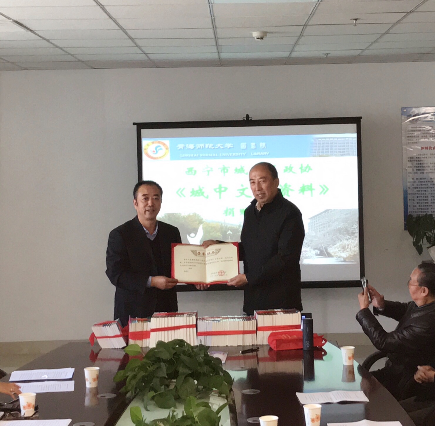 10月12日上午,西宁市城中区政协《城中文史资料》图书捐赠仪式在365官网举行。捐赠仪式由图书馆田援青书记主持,校党委宣传部副部长王兆宁、城中区政协副主席王青江、童永菊、文史专家及图书馆各部主任参加了捐赠仪式。