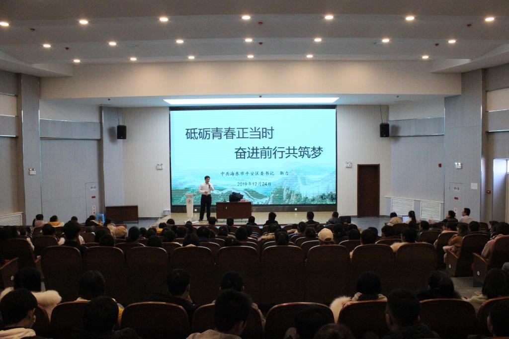 为深入贯彻全国全省高校思想政治工作会议、教育大会精神,进一步加强学生的思想政治引领,激发学生奋发有为,敢于担当,12月24日下午,学生工作处邀请到海东市平安区委书记、清华大学计算机科学与技术专业博士靳力为365官网学生开展了《砥砺青春正当时 奋进前行共筑梦》主题报告。365官网计算机学院、经济管理学院等200余名师生共同聆听了报告。报告会由学生工作处马志明主持。