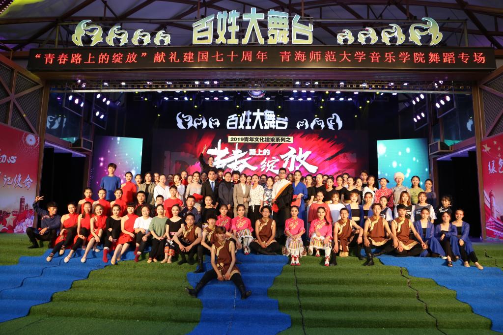 7月3日晚,西宁市百姓大舞台热闹非凡,为了庆祝建国七十周年,积极推进校园文化建设,拓展学生实习实践平台,促进学生专业素养的综合发展,音乐学院在中心广场百姓大舞台举办了“青春路上的绽放”舞蹈专场艺术实践汇演。西宁市文化馆党支部书记杨志杰、音乐学院党总支副书记宋睿青参加了活动,来自各区的群众观看了演出。