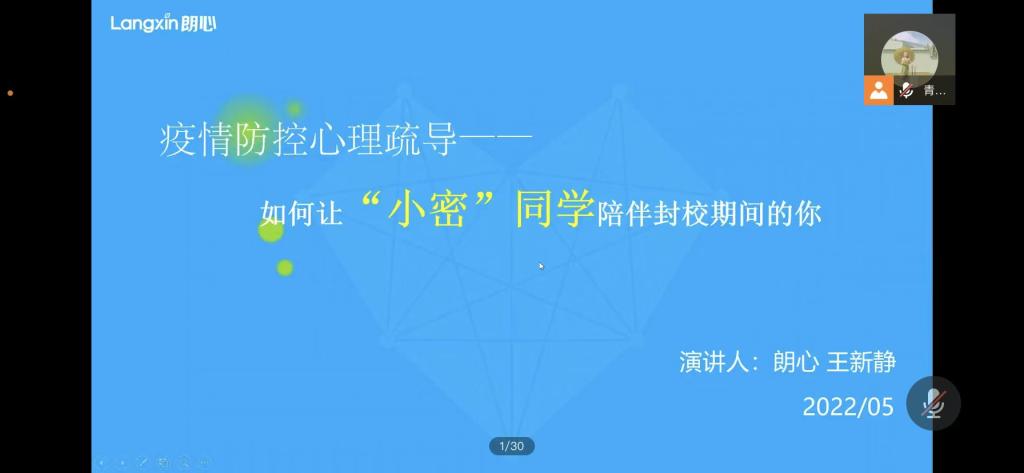 5月18日,bat365在线平台登录心理健康教育与培训中心特邀北京朗心致远科技有限公司的王新静老师以腾讯会议的形式为全校师生开展了《疫情防控心理疏导——如何让“小密”同学陪伴封校期间的你》的线上专题讲座。