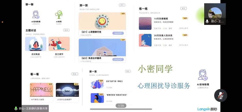 讲座中,王老师以疫情封控中同学们的真实生活片段作为背景,引发同学们的情感共鸣,之后以专业心理学原理的角度,详细讲解了密友AI心理自助小程序的设计初衷及使用方法,并为同学们答疑解惑,获得了同学们的一致好评与积极反馈。