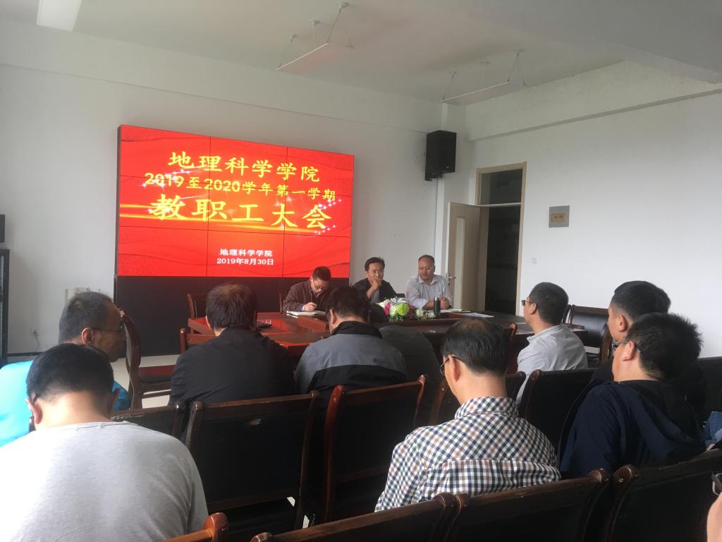 8月30日下午,地理科学学院召开了新学期工作部署会,学院全体教师参加了会议。学院各职能科室针对各自负责的工作,从教学事务管理、学生日常管理、相关文件的传达学习等方面向全院教职工进行了通报。