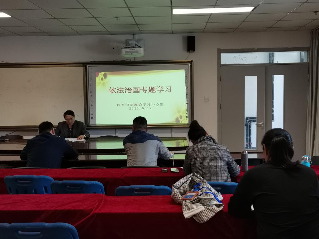 6月17日,体育学院理论学习中心组开展依法治国理论专题学习会,深入学习习近平总书记关于依法治国的重要论述,进一步把思想和行动统一到以习近平同志为核心的党中央关于全面依法治国的重大战略部署上来。学院中心组成员参加会议,会议由党总支书记冯继有主持。