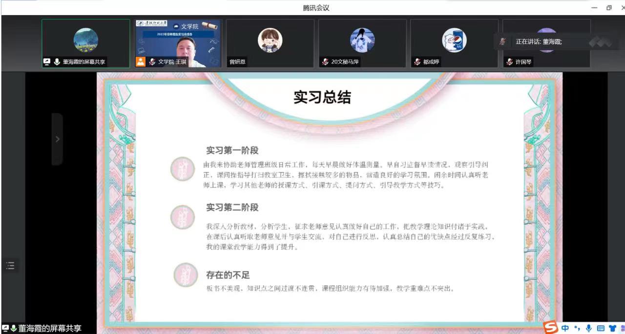 6月23日晚19时,文学院汉语言文学(行政文秘)专业线上召开了汉语言文学(行政文秘方向)2019级实习总结会暨2020级实习动员大会,2019级及2020级文秘专业学生80余人参加,会议由学院非师范生实习指导教师王琪老师组织,大会议程共三项。