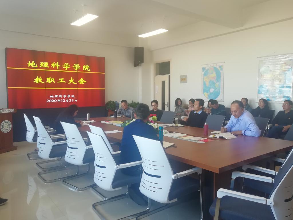 12月23日下午,地理科学学院召开全院教职工大会,就学院学期期末各项工作进行安排部署。会议由院党总支书记杨登兴主持,副书记洛加才让,副院长毛旭锋、杨显明,院长助理鄂崇毅及学院全体教师参加会议。