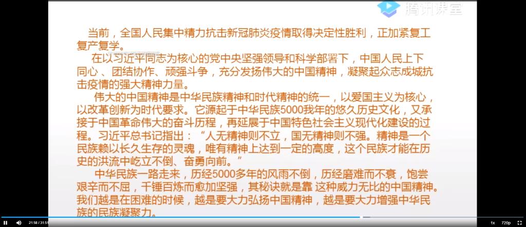 根据学校的统一要求,4月19日晚,计算机学院通过腾讯课堂进行返校学习思政课教育。本次思政课以“中国力量 共抗疫情”为题,由学院书记谢锟主讲,全体学生和部分老师参加。