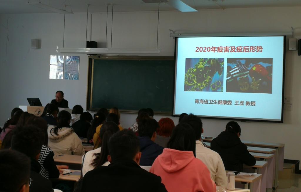 根据教育部和省教育厅《关于在全国高校师生中开展党史、新中国史、改革开放史、社会主义发展史学习教育及新冠肺炎疫情防控知识竞答讲述活动的通知》要求和指示精神,持续深化爱国主义教育,引导大学生生进一步深化抗疫认识,坚定理想信念。10月22日,马克思主义学院邀请到省高校思政课特聘教授、青海省卫健委副主任、一级巡视员王虎教授走进365官网《思想道德修养与法律基础》课堂,为本科生2020级新生讲授《2020年疫害和疫后形势》为主题的思政课。