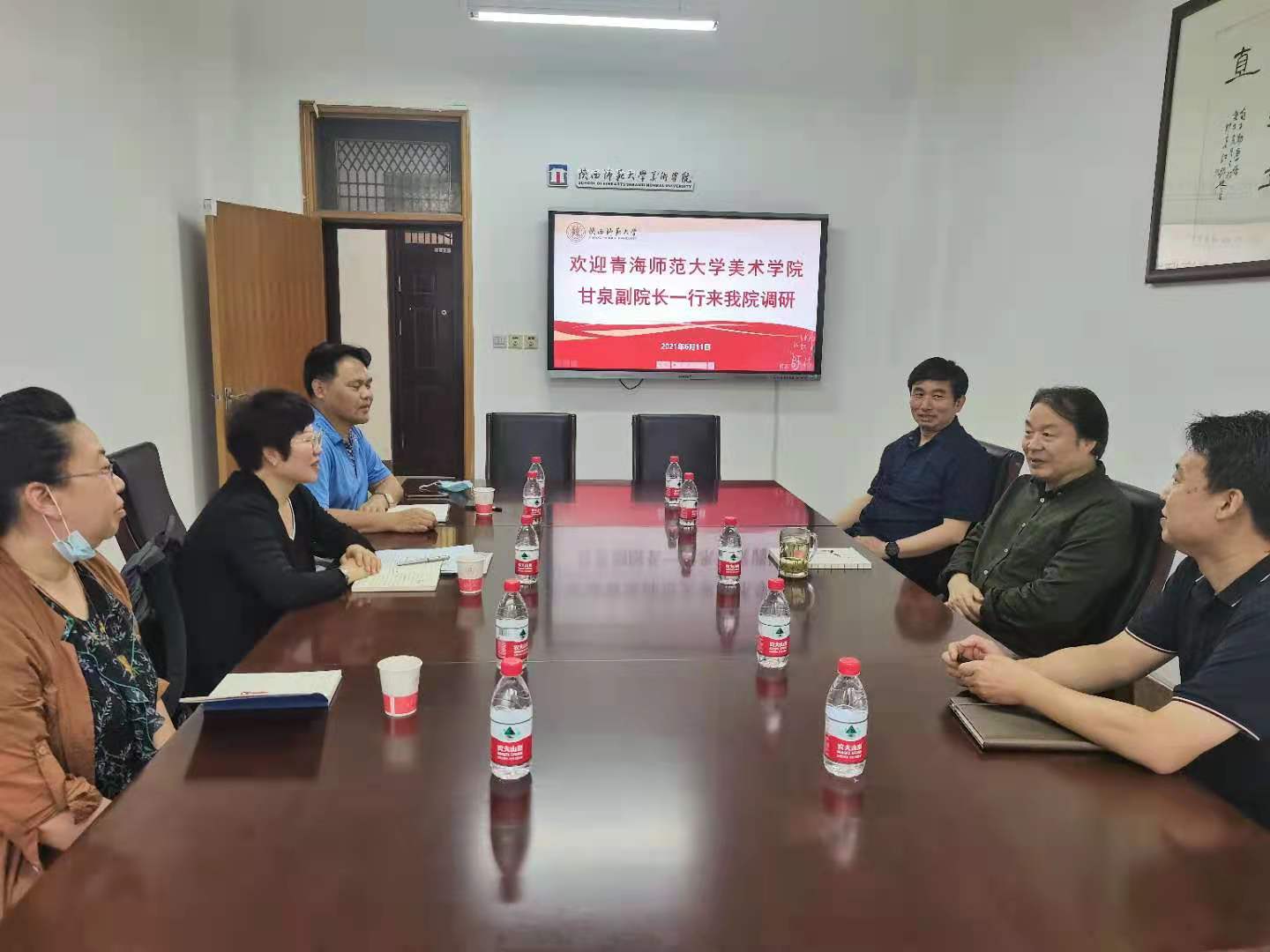 6月11日,在陕西师范大学召开了对口支援推进工作会议,陕西师范大学美术学院书记甄军军、院长冯民生、副院长窦项东等参加了会议。冯民生就陕西师范大学美术学院学科建设、课程建设、专业评估、未来发展规划等事宜作了详尽介绍;甘泉就bat365在线平台登录美术学院的基本情况作了汇报,特别是对学院立足地域特色发展民族教育、青藏高原题材绘画创作、服务青海省地方经济发展的青绣项目等作了详尽的介绍,并真诚邀请陕西师范大学美术学院参与这些项目的合作与研究。