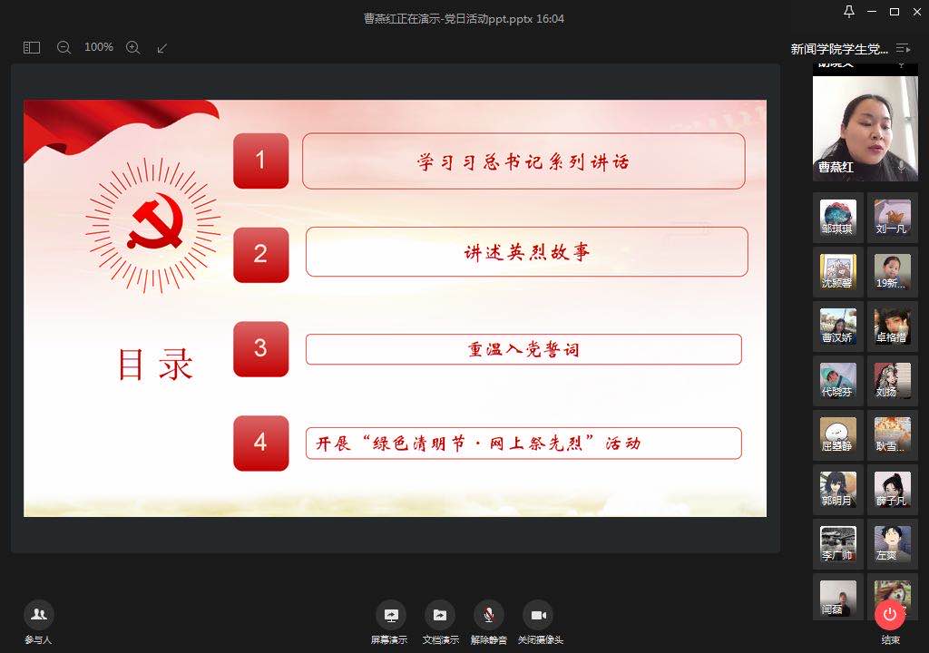 4月2日,新闻学院学生党支部开展“绿色清明节·网上祭先烈”主题党日活动。活动由学生党支部书记曹燕红主持,党支部全体成员参加。
