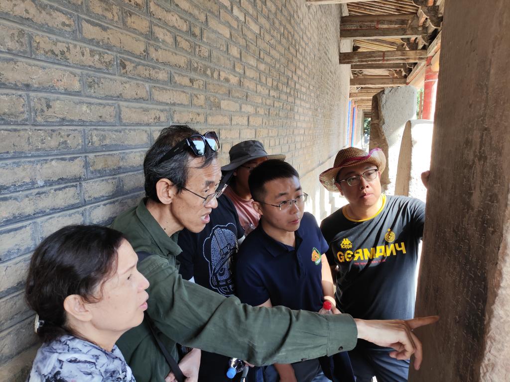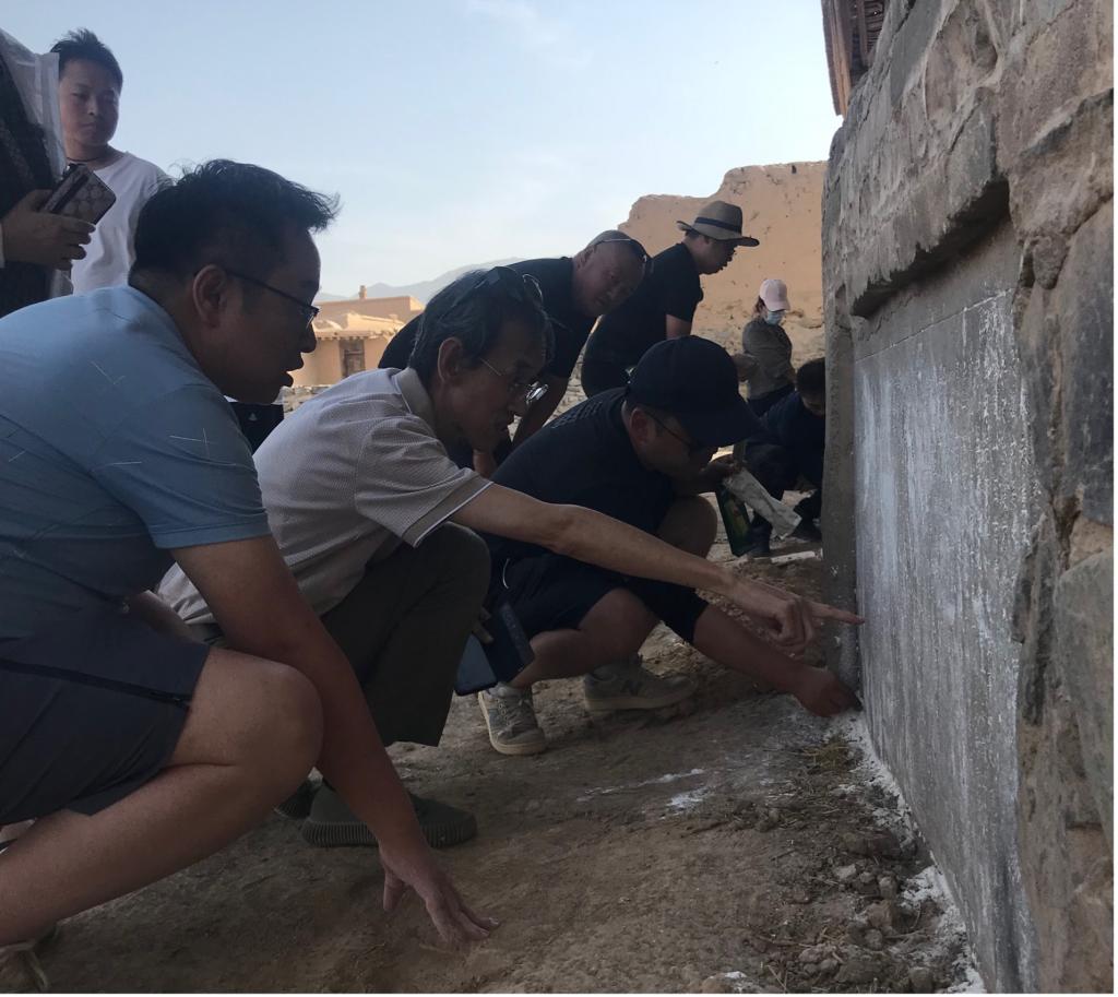 8月1日至2日,考察组先后进入永泰古城、松山古城、感恩寺,对永泰古城进行了重点考察。永泰古城,建于明万历三十六年(1608),历史悠久,城中出土、保存了丰富的历史史料和文化遗存。城内戏台底部存有康熙初年“永泰重修诸圣阁记”碑,字迹依稀可见。在赵老师的指导下,考察组对碑文进行了辨读,进一步了解了永泰古城的历史。此外,考察组还对永泰古城及景泰县城部分居民进行走访,翻阅了部分谱牒文献,并进行拍照存留。
