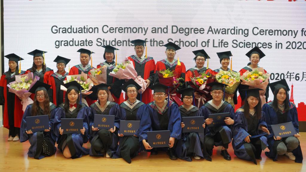 马俊宣读了学校关于生命科学学院本科生、研究生毕业和授予学位的决定,冶成福为获得硕士学位的同学颁发学位证书,生命科学学院副院长王文颖教授为获得学士学位的同学颁发学位证书,生命科学学院院长助理苏旭教授为获得2020届优秀毕业生颁发了证书。