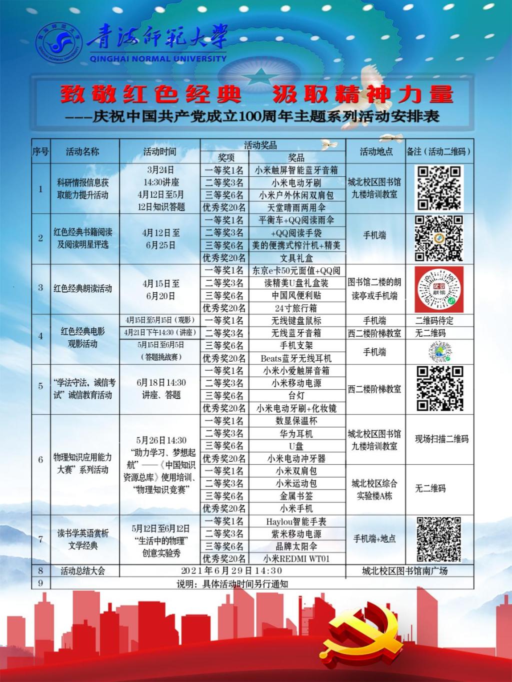 活动涉及“科研情报信息获取能力提升”,“红色经典书籍阅读及阅读之星评选”,“致敬红色经典、汲取精神力量朗读比赛”,“红色经典电影观影”,“遵纪守法、诚信考试法制教育”、“物理知识应用能力大赛”,“读书学英语、赏析文学经典”等七大主题模块,十四个分主题活动,通过系列活动的开展将党史教育学习融入教学课堂、融入社会实践、融入网络阵地,引领学院教风、学风建设。全院师生积极参加,党员充分发挥模范带头作用,以崭新的精神风貌、优异的成绩献礼建党100周年。