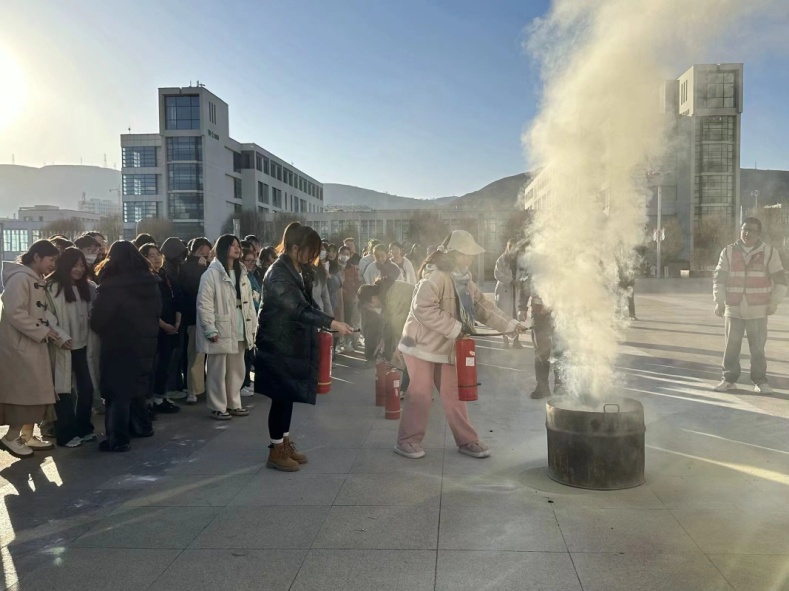 “纸上得来终觉浅,绝知此事要躬行。”授课结束后,在图书馆广场演示了火灾逃生方式和干粉灭火器使用方法,并组织同学进入模拟仓进行逃生演练。同学们动手实操,掌握了灭火自救技能。