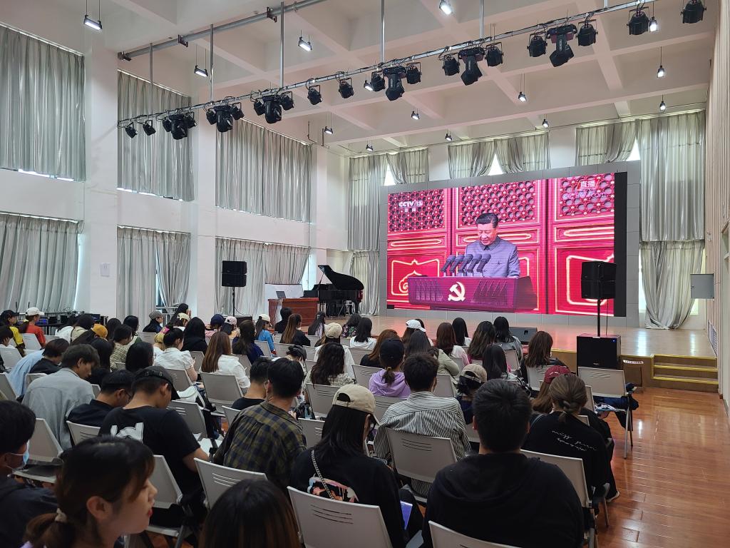 7月1日上午8时,庆祝中国共产党成立100周年大会在北京天安门广场隆重举行,中共中央总书记、国家主席、中央军委主席习近平发表重要讲话。音乐学院组织师生在音乐楼四楼多功能厅收看庆祝大会直播盛况,共同见证激动人心的历史时刻,感受中国共产党成立100周年取得的辉煌成就。