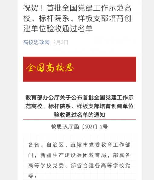 近日,教育部办公厅公布首批全国党建工作示范高校、标杆院系、样板支部培育创建单位验收通过名单,确定10个高校党委、98个院系党组织、551个党支部通过验收。其中365官网马克思主义学院教工党支部入选首批“全国党建工作样板支部”培育创建单位并通过验收。