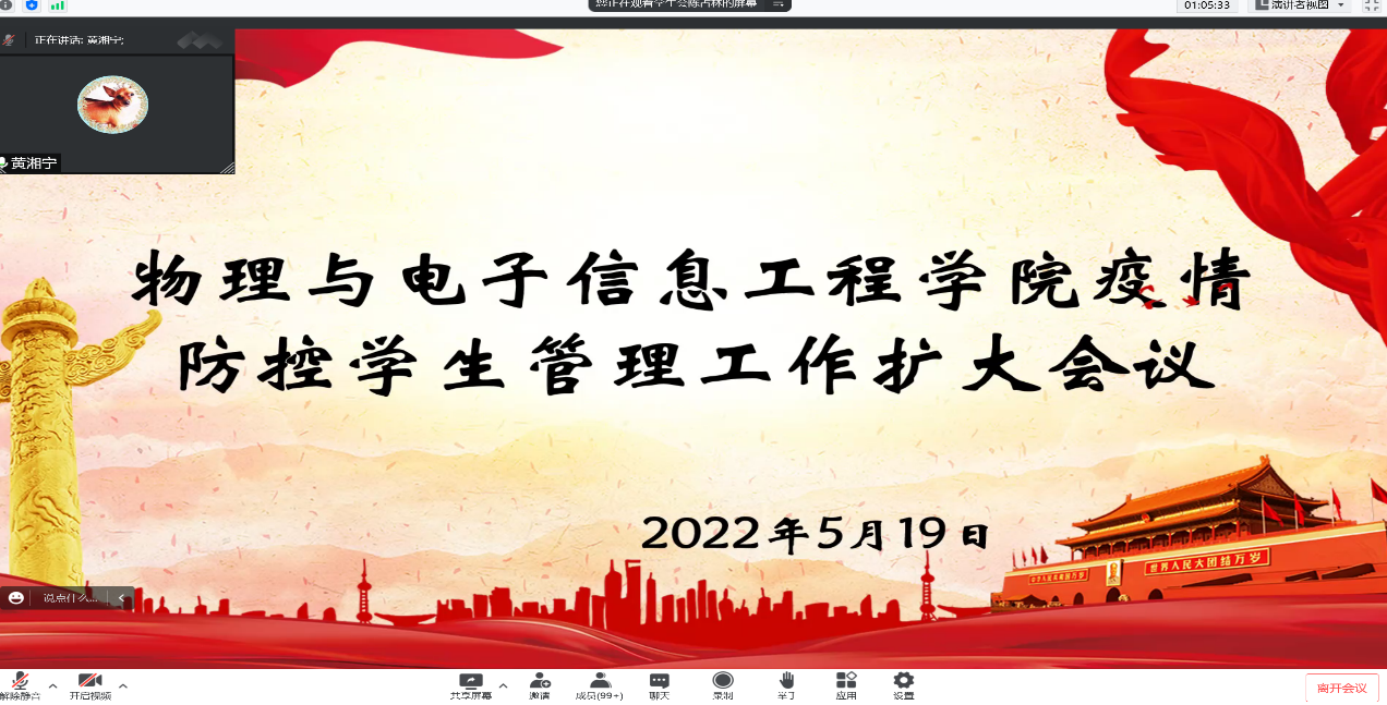 5月19日晚,物理与电子信息工程学院召开疫情防控学生工作管理会议。院长黄湘宁、全体辅导员以及学院各组织负责人和各班班委参加了会议。会议由刘松老师主持。