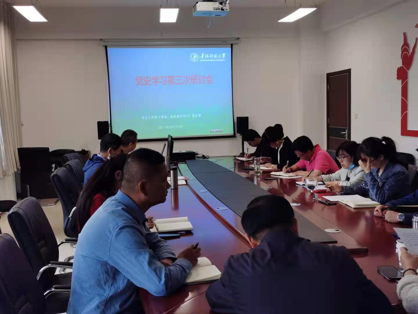 6月22日上午,学生工作处(团委、就业指导中心)党支部在行政北三楼会议室召开党史学习教育第三次专题研讨会,全体党员和教职工参加。
