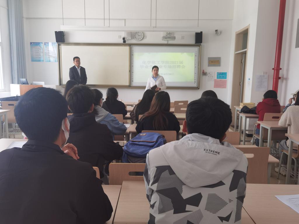 为做好2021届毕业生就业工作,4月28日下午,化学化工学院召开2021届毕业生专场招聘会。青海观谷生态环境科学研究院有限公司和天津友美环保科技公司来校宣讲,招聘会由院党总支副书记崔香主持。