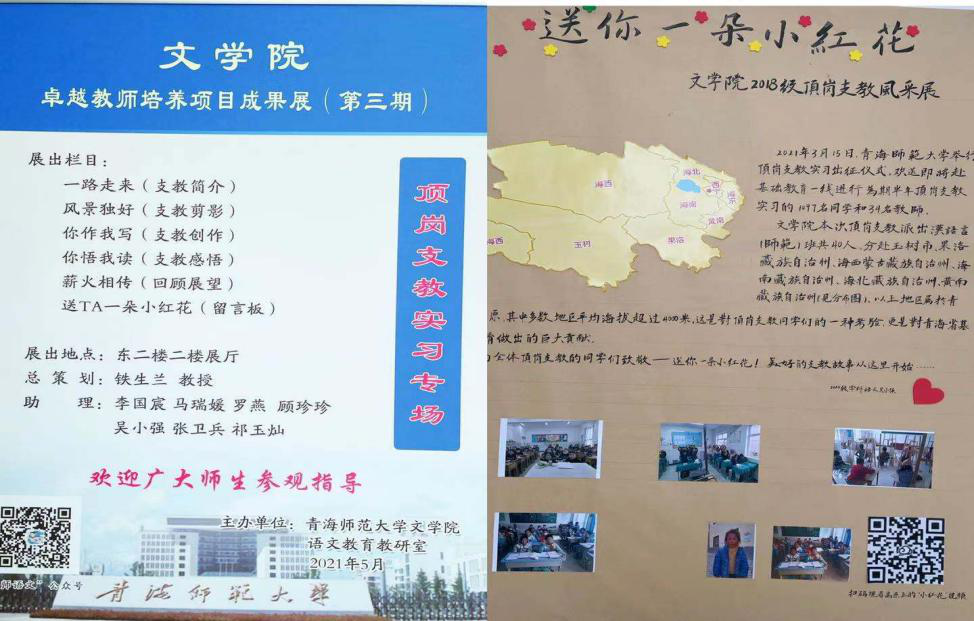 文学院5月“青师语文杯”卓越教师培养项目成果展以“顶岗支教实习专场”为主题,举办了一期卓越教师项目成果展,主要设有“一路走来”(支教简介)、“风景独好”(支教剪影)、“你作我写”(支教创作)、“你悟我读”(支教感悟)、“薪火相传”(回顾展望)、“送TA一朵小红花”(留言板)六个栏目展出。
