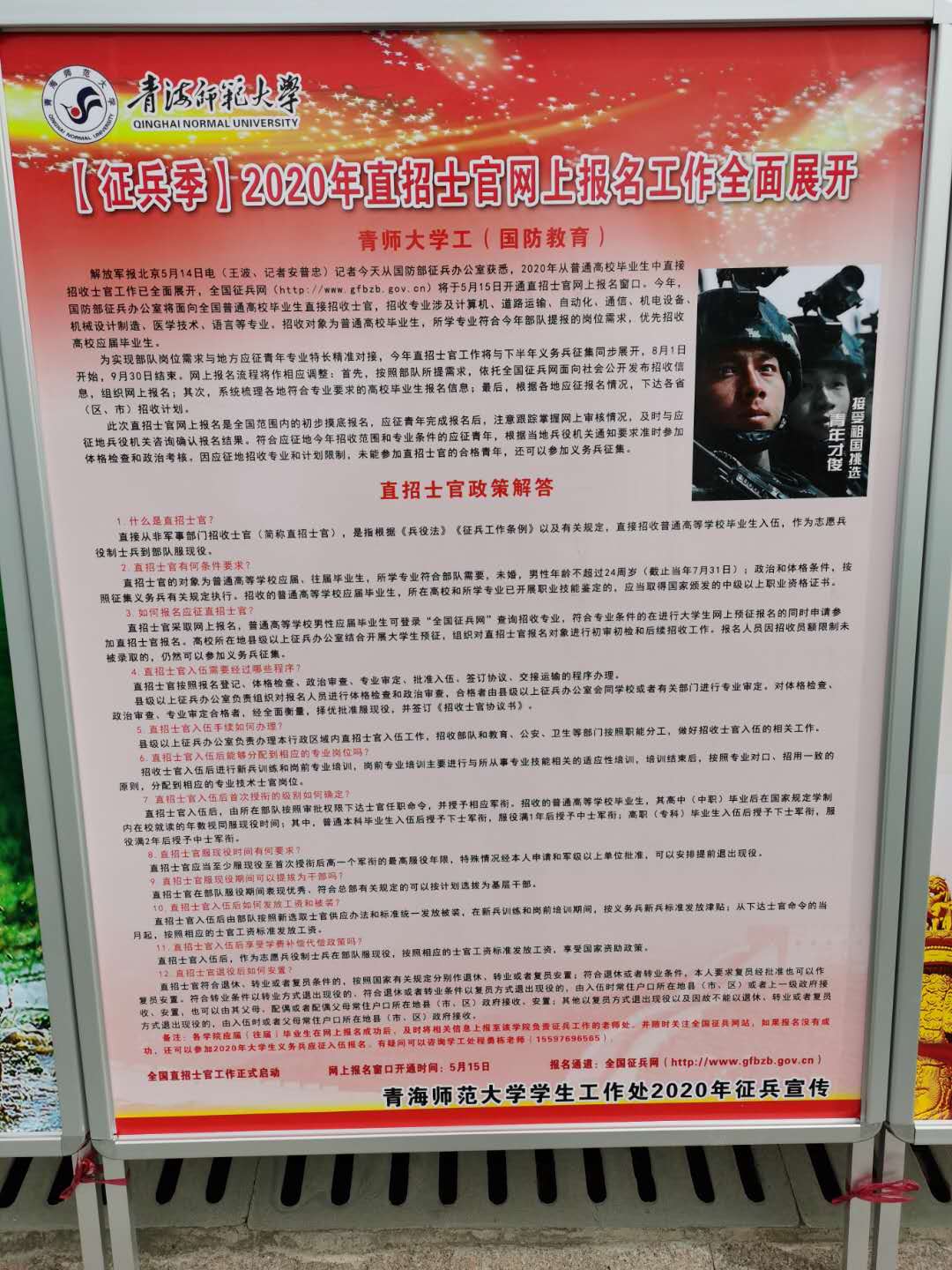 此外,学生工作处还在“学工小微”微信公众号、辅导员QQ群、学校征兵工作微信群等开展网上征兵宣传,实现了“零接触”“一键式”报名应征;学工处征兵站老师和学院辅导员利用“微信群”“朋友圈”推送征兵信息,参军优惠政策,实行“一对一、点对点”精准宣传发动,切实打通大学毕业生参军“最后一公里”。
