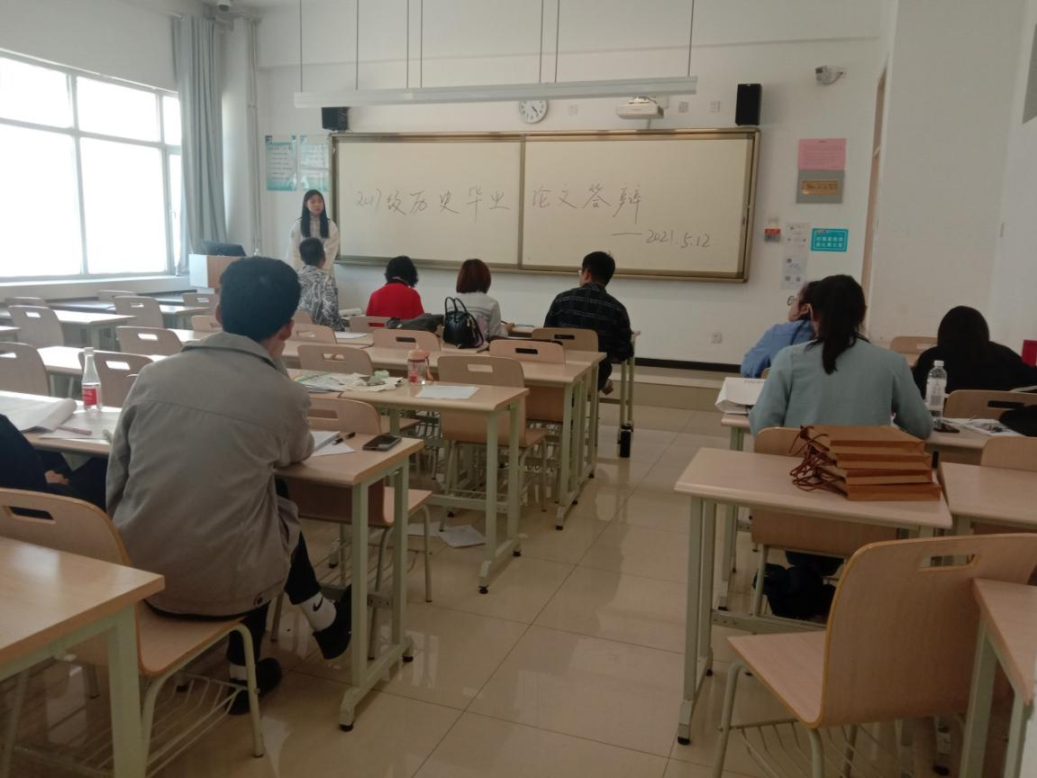 5月12日下午,历史学院在教学楼教室举行2021届毕业生的论文答辩会。答辩分为六个小组,每个小组包括3-4位评委老师和7名答辩学生。