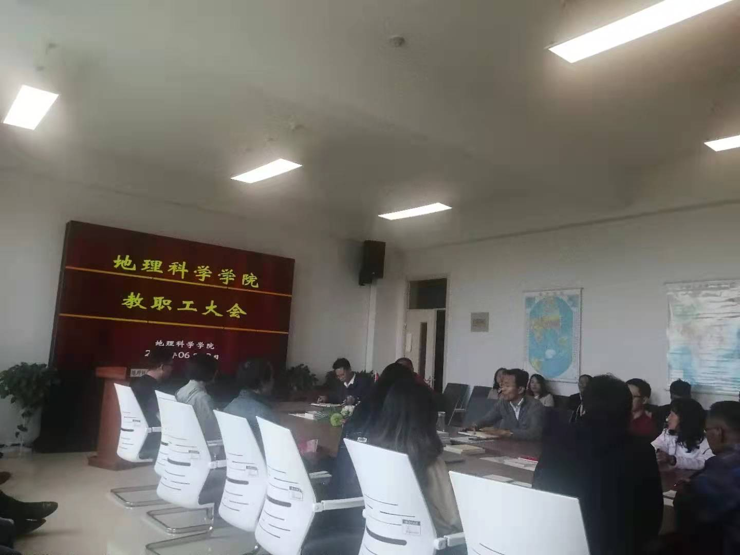 6月2日下午,地理科学学院召开全院教职工大会,对学院近期重点工作进行统一安排部署。会议由院长葛岳静主持,院党总支书记、副院长杨登兴,副书记洛加才让,副院长毛旭锋、杨显明及学院全体教师参加会议。