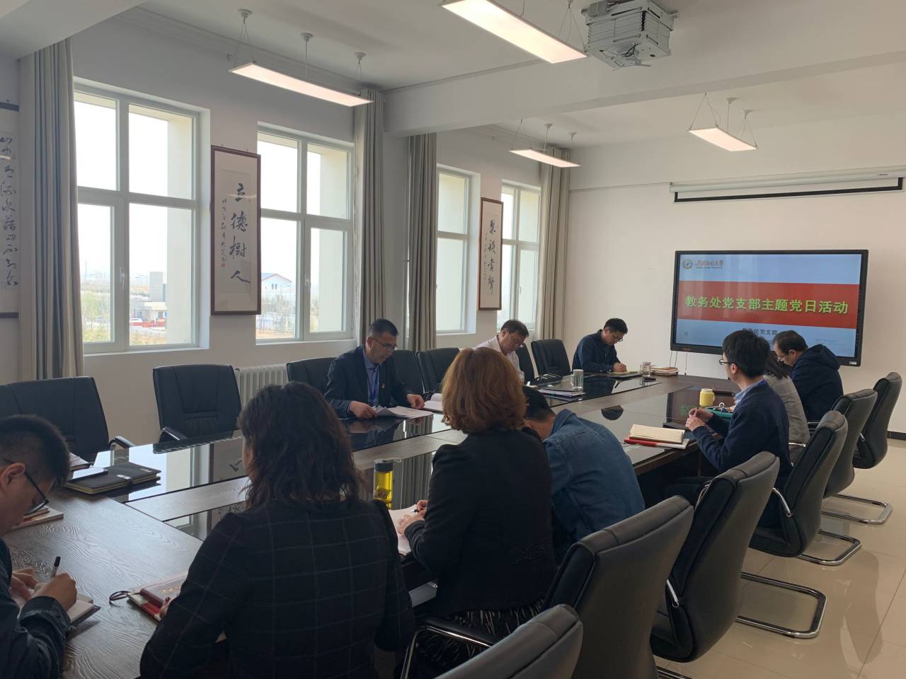 为深入学习省委书记、省人大常委会主任王建军同志在思想政治理论课工作座谈会上的讲话精神,贯彻学校有关学习讲话精神和疫情防控工作的重要指示,4月20日上午,教务处党支部举行了主题党日活动,活动由教务处党支部书记马俊主持,教务处全体党员参加了活动。