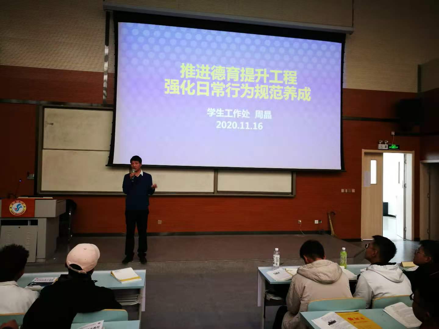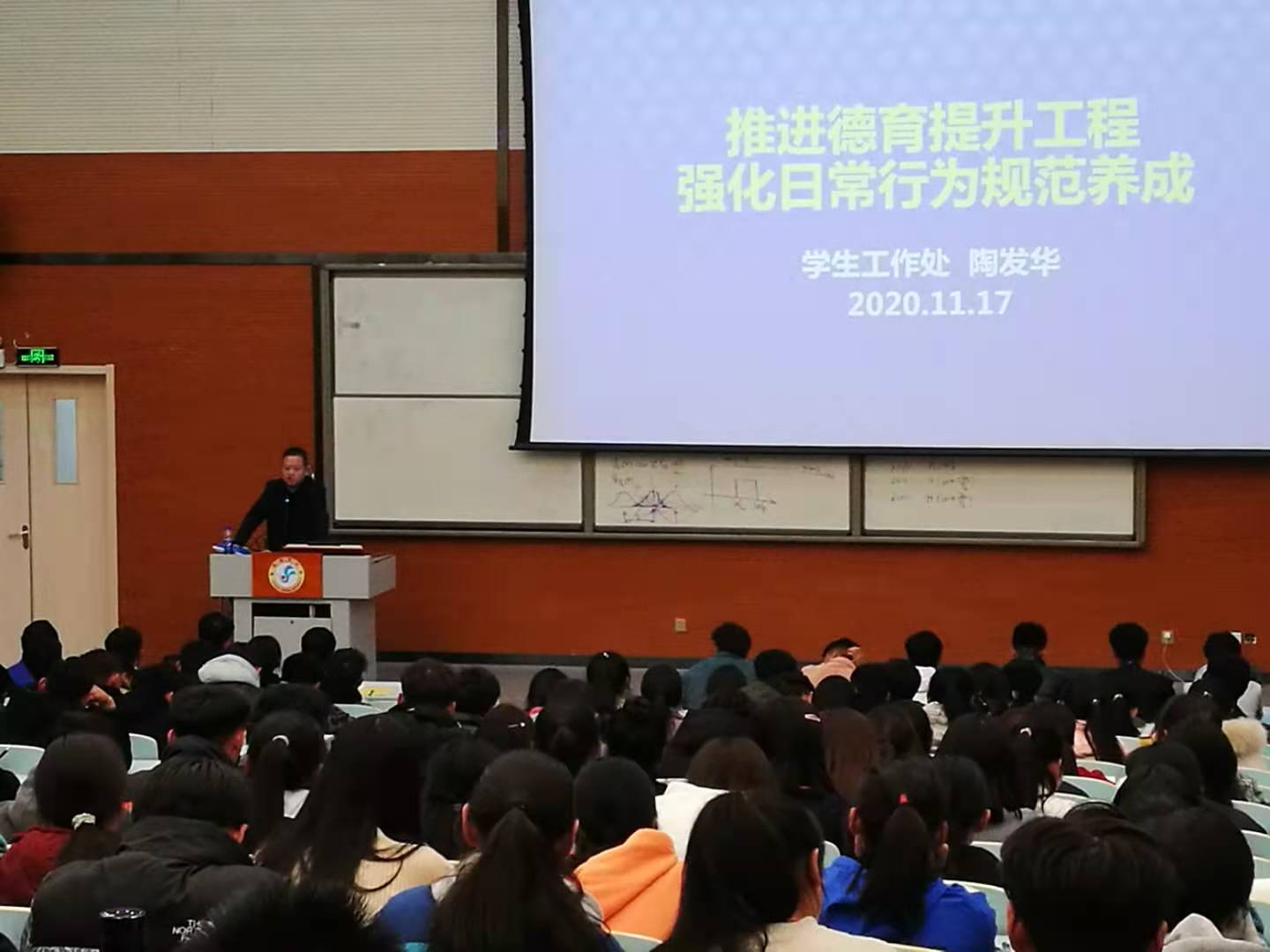 为深入推进德育提升工程,做好人才培养的源头工程,教育引导新生尽快转换角色、适应环境,在各学院入学教育“六说”的基础上,学生工作处于11月16、17日深入到学生课堂面对面为学生组织开展了德育提升工程、“四史”专题教育、行为规范养成等内容的四场讲座,先后共计1600余名新生参加活动。
