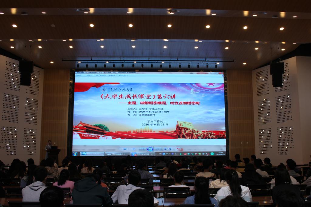 为帮助学生树立正确婚恋观,正确处理学业和感情生活的关系,提升365官网大学生心理健康水平,6月23日下午,由学生工作处主办的大学生成长讲堂第六期“破解婚恋难题,树立正确婚恋观”的讲座在图书馆报告厅举行。讲座由365官网已退休的思想政治教育教授王大钊主讲,学生工作处副处长陶发华、学工处相关人员和来自各学院200余名同学共同聆听了讲座。