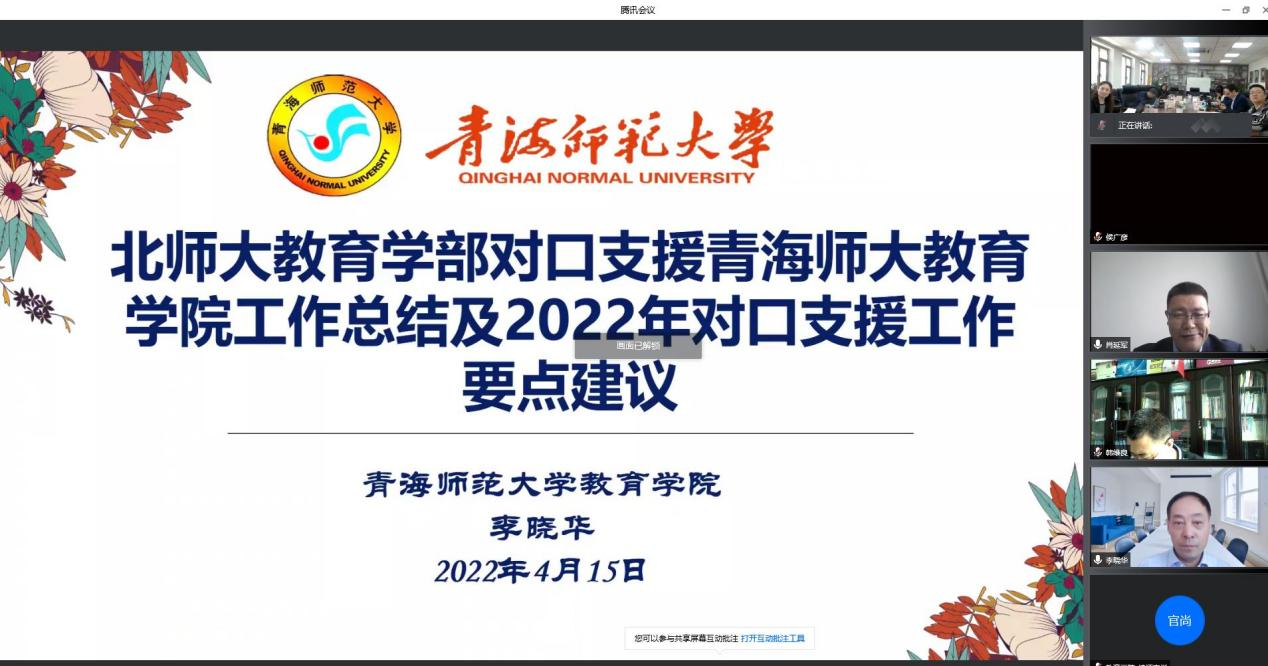 为总结2021年北京师范大学教育学部对口支援bat365在线平台登录教育学院的工作情况,谋划和推进2022年对口支援有关事宜。4月15日,教育学院以线上形式举行了“北京师范大学教育学部对口支援bat365在线平台登录教育学院工作会议”。北京师范大学教育学部部长朱旭东教授、武法提教授、王本陆教授、李琼教授、薛二勇教授等11位教师,bat365在线平台登录对口支援办公室主任肖延军、教育学院党支部书记韩维良、发展规划处处长武启云、副院长赵慧莉和张春海等14位教师参会。会议由北京师范大学教育学部培训管理办公室主任张倩和bat365在线平台登录教育学院院长李晓华主持。