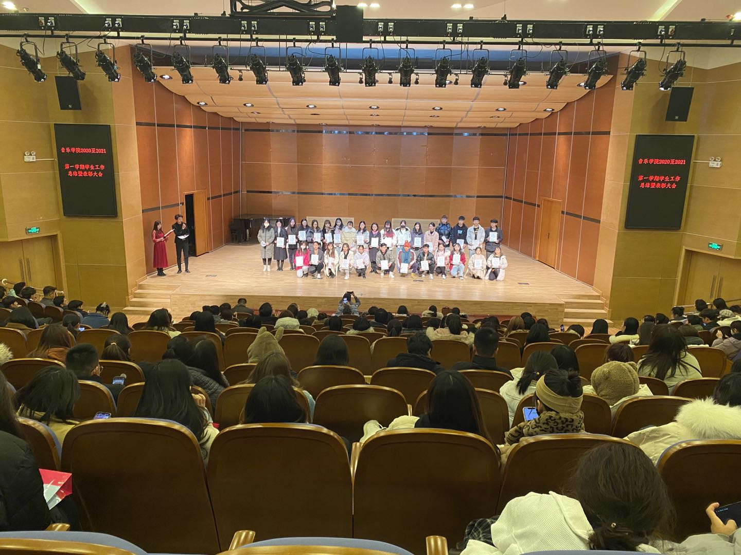 1月3日晚,音乐学院在音乐厅召开2020至2021第一学期学生工作总结暨表彰大会。音乐学院党总支书记王永革、党总支副书记宋睿青,辅导员、班主任及全体学生参加了大会。