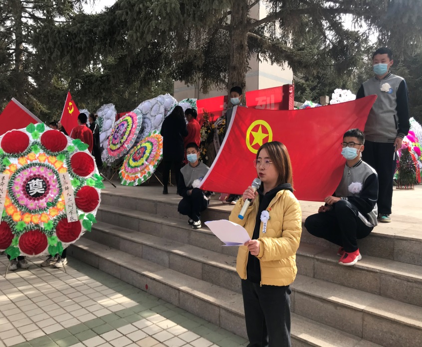 首先,由初中年级组长刘兵国老师宣布活动开始,在低沉肃穆的哀乐中,全体师生面向烈士默哀,并向烈士纪念碑敬献花圈。随后,学生代表童延蒙同学代表全体学生,表达了对革命烈士的深切缅怀与无限敬仰。最后,团委副书记马丽娟老师带领大家在巍巍的烈士墓碑下,在庄严的团旗下重温入团誓词并讲述了此次活动的意义并向共青团员提出了要求。