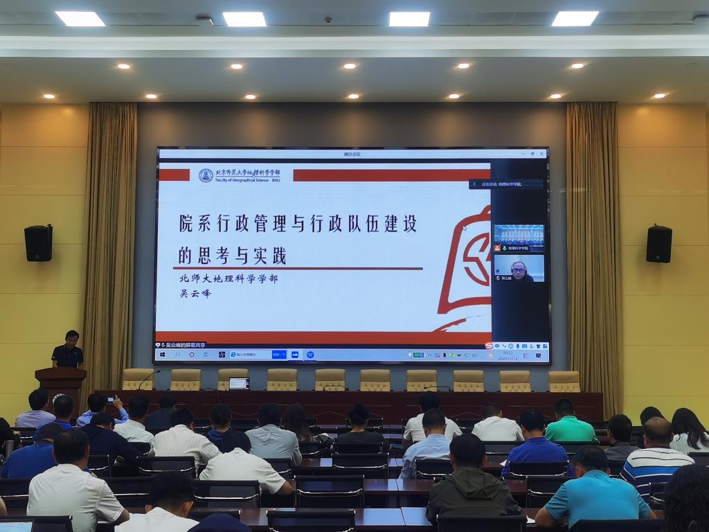 为进一步提升学校行政管理干部业务水平和履职能力,建设一支具有较高政治理论素养、作风优良、具有较高执行能力、善于管理、团结合作、敢于担当、勇于创新的行政管理队伍,7月12日,由党委组织部主办、地理科学学院承办的全校行政管理干部专题培训在行政楼一楼报告厅举行。本次培训邀请了北京师范大学地理科学学部常务副部长吴云峰作了“高校院系行政管理与行政队伍建设的思考与实践”为主题的线上讲座,全校处级干部、各学院行政人员参加了培训。